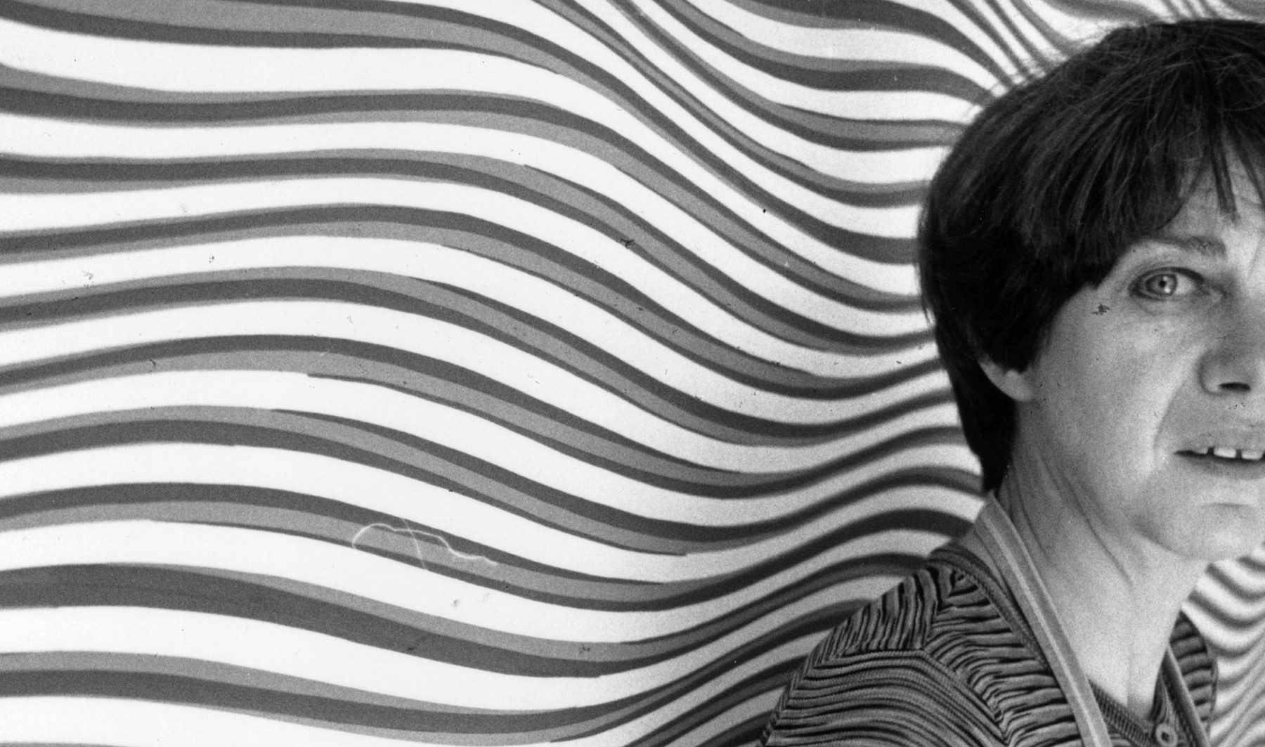 26th July 1979: Bridget Riley, British painter and leading figure in the Op Art movement, standing in front of one of her curving ‘line’ paintings at her studio. (Photo by Evening Standard/Getty Images)